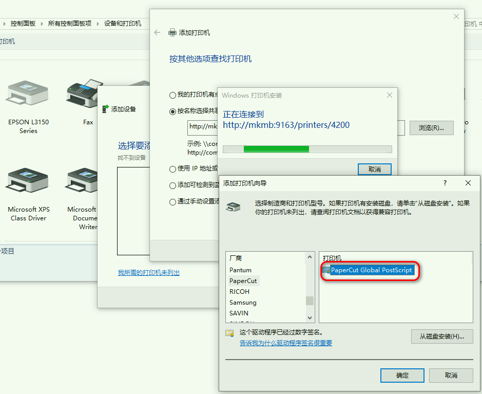 注意:如果用安装向导没有安装成功,手动添加打印机:
